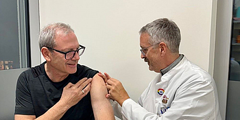 Die Grippeschutzimpfung bietet den besten Schutz vor der saisonalen Influenza und sollte jährlich aufgefrischt werden. Um mit gutem Beispiel voranzugehen, ließ sich Thomas Zöller, der Patienten- und Pflegebeauftragte der Bayerischen Staatsregierung, von Prof. Dr. Jörg Schelling in dessen hausärztlicher Praxis in Martinsried impfen. „Machen auch Sie mit – schützen Sie sich selbst und Ihre Mitmenschen“, lautet sein dringender Appell.