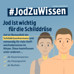 Jod ist ein lebensnotwendiges Spurenelement, das der Körper nicht selbst bilden kann. Es ist unverzichtbar für die Bildung von Schilddrüsenhormonen, die zahlreiche Stoffwechselprozesse steuern. Jodmangel kann zu einer Schilddrüsenvergrößerung – umgangssprachlich „Kropf“ genannt –, zu Schilddrüsenknoten und -funktionsstörungen führen. Das wiederum hat Auswirkungen, beispielsweise auf das Körpergewicht, die Konzentrationsfähigkeit, den Blutdruck oder die Verdauung. Jodmangel in der Schwangerschaft und Stillzeit sowie im Säuglings- und Kleinkindalter kann unter anderem zu Entwicklungsstörungen des Kindes führen.